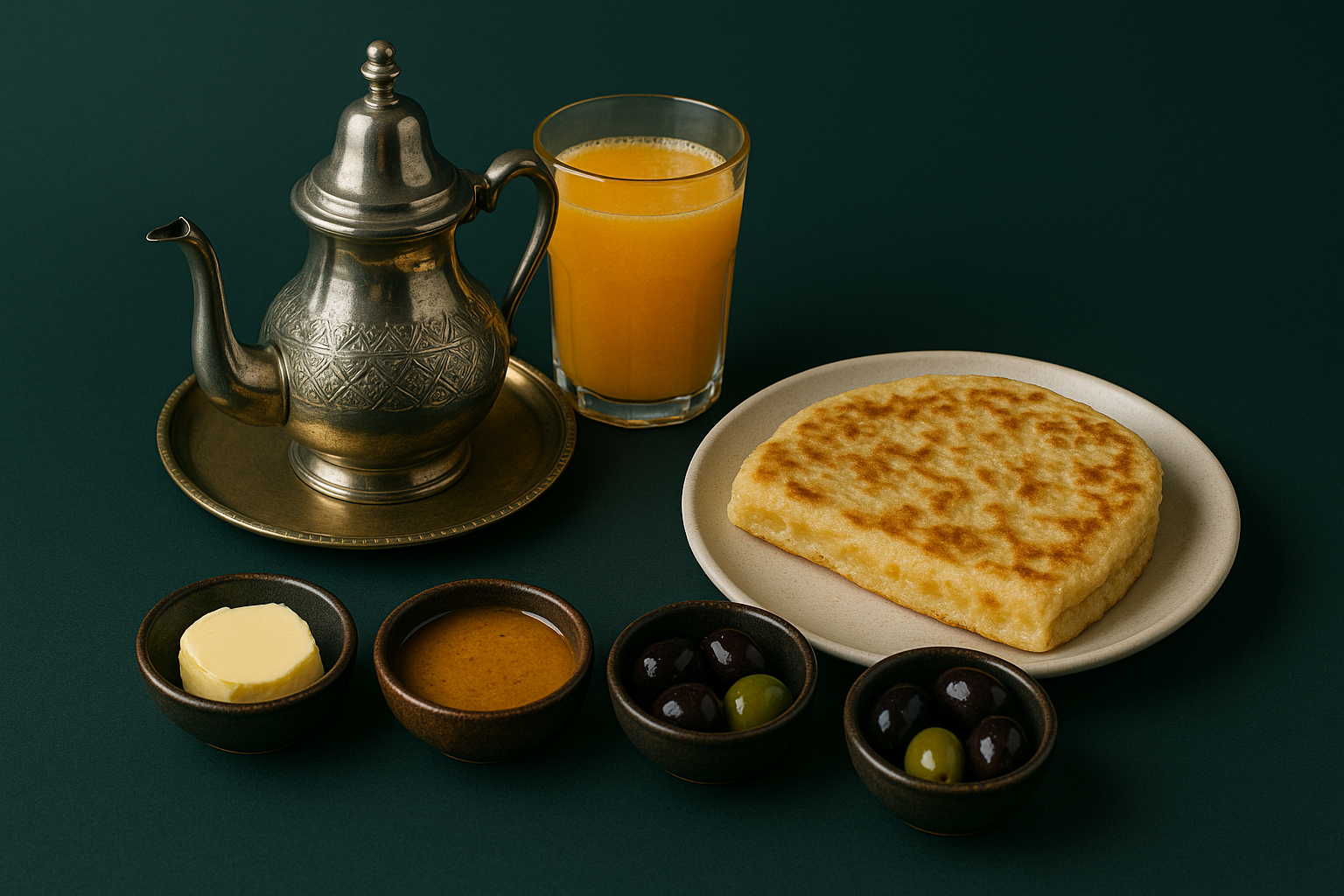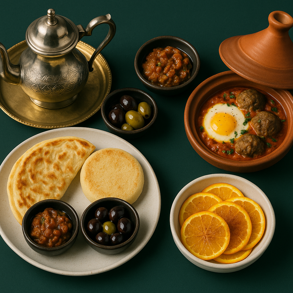 Votre brunch méditerranéen, signé Bazile & Saveurs : batbout, chakchouka ensoleillés, salades croquantes, pastilla, jus de fruits frais et douceurs maison